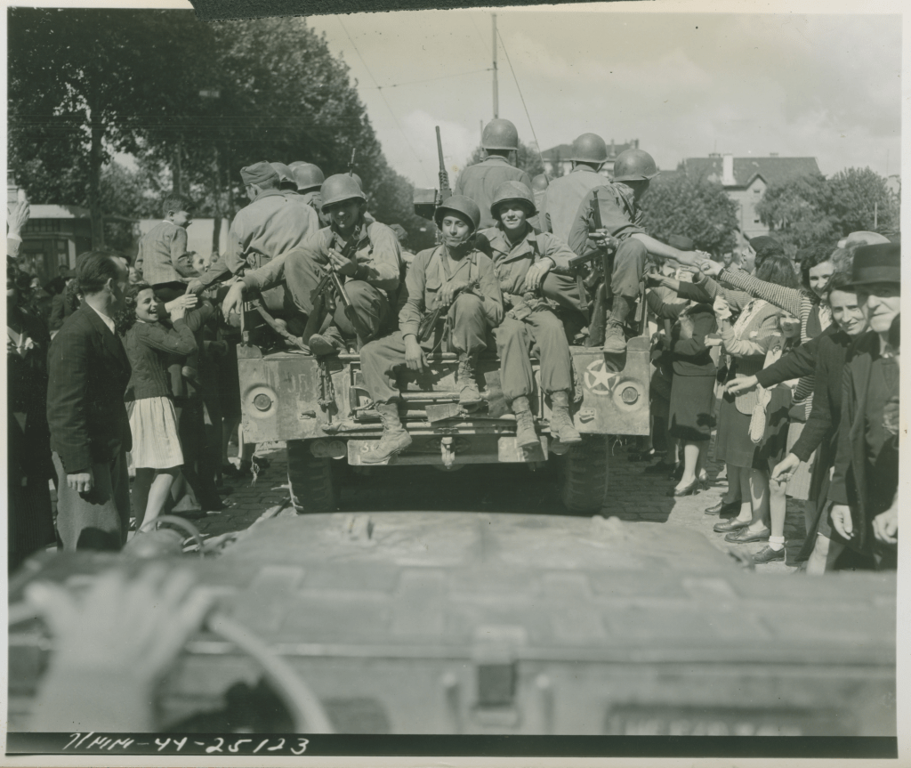 French civilians welcome U.S. troops in Lyon, France, 1944. Source: The Digital Collections of the National WWII Museum