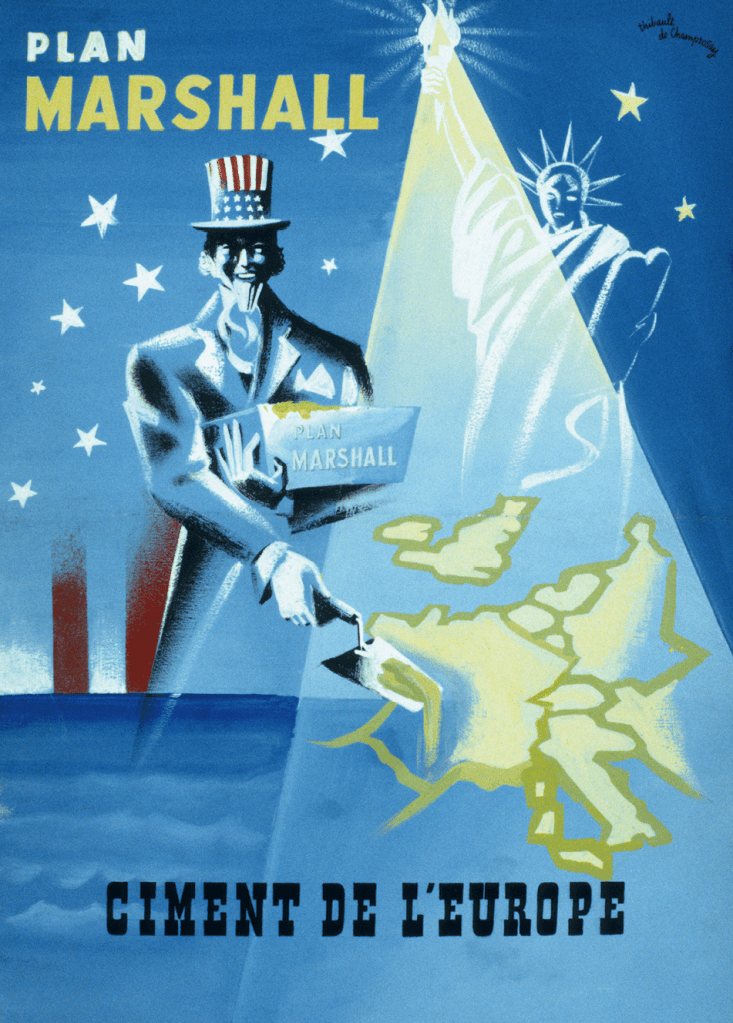 ‘Marshall Plan – cement of Europe’ — French poster (ca. 1947-8) showing Uncle Sam rebuilding Europe, with the State of Liberty shining her torch down on the continent. Design by Thibault de Champrosay.